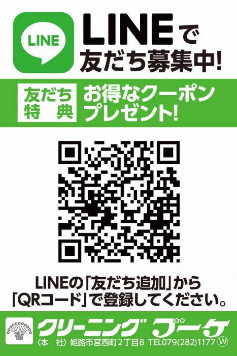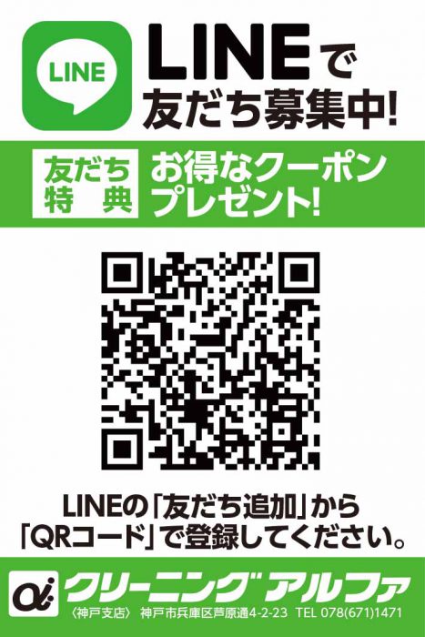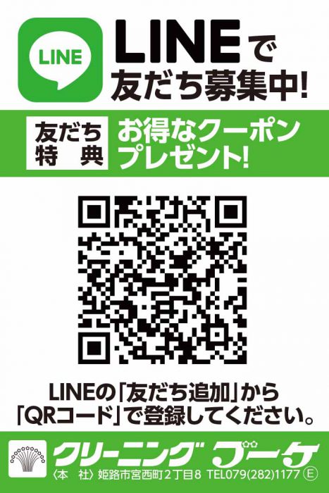 現在、LINEお友だち追加特典といたしまして、『ドライクリーニング品(寝具類除く) 2点まで半額』特典を配布しております。