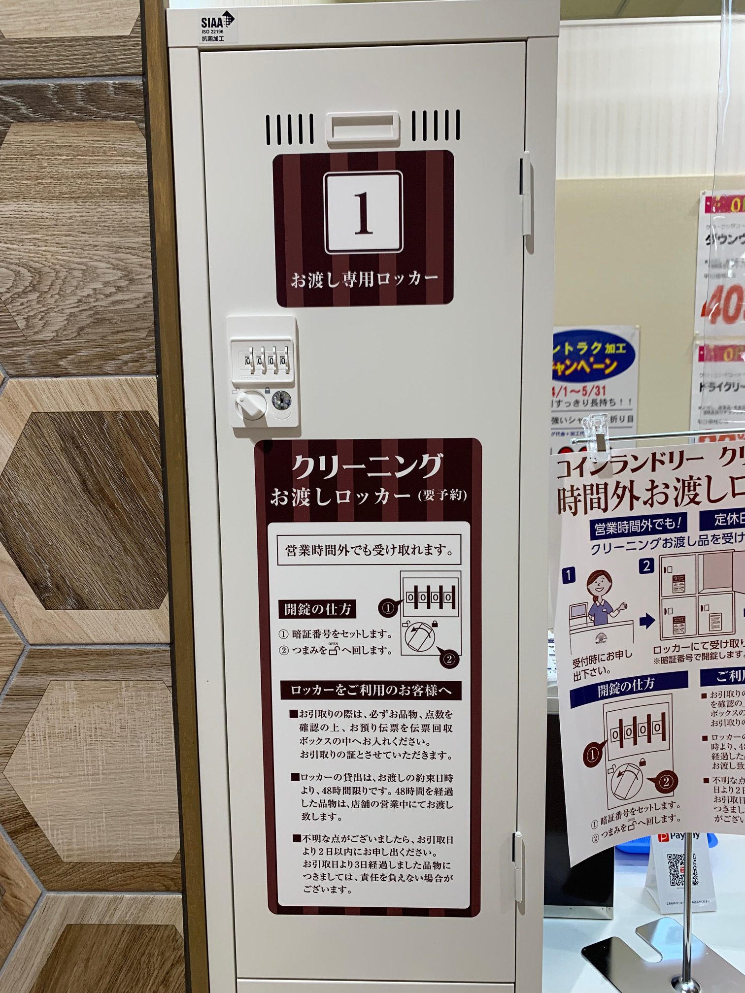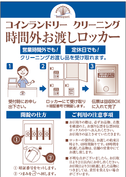 コロナ禍により、営業時間の短縮や、定休日の設定など、ご利用のお客様には大変ご迷惑をお掛け致しており、ご利用のお客様には申し訳ない気持ちでいっぱいです。この度、『営業時間外お渡しロッカー』を設置することにより、クリーニング店舗営業時間外でも定休日でも、朝5時~夜24時まで引き取れるようになっております。