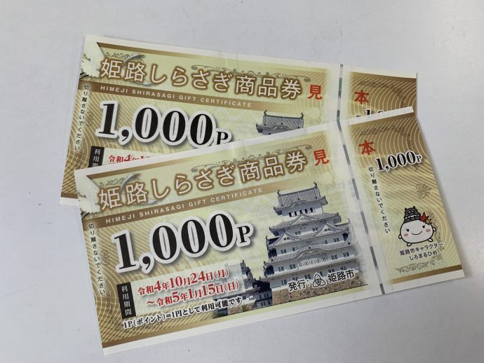 10,000円で12,000円分利用できるオトクな商品券です。まだ、お持ちではない方は、現在、追加販売も行われているようです。https://himeji.prm-shohinken.com/