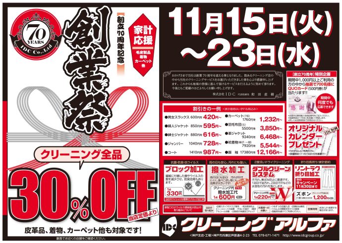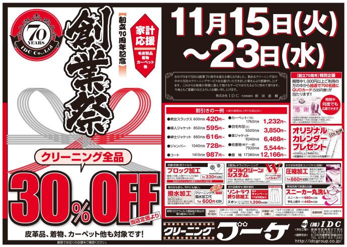 今年は、70周年の特別イヤーということで、クリーニング ブーケ全店とクリーニング アルファ(コープ店除く)店舗にて、明日11月15日(火)~23日(水・勤労感謝の日)の9日間、創業祭恒例企画「クリーニング全品 当店定価より30%引き!」に加えて、「オリジナルQUOカード(500円券)を抽選で700名の方にプレゼント!」の特別企画を行います。期間中、1,000円以上のご利用で1回ご応募できます。おひとり様何回でもご応募できますので、当選確率はグッと上がります。ご利用をお待ちしています。詳しくは、ご利用店舗にお問い合わせくださいませ。